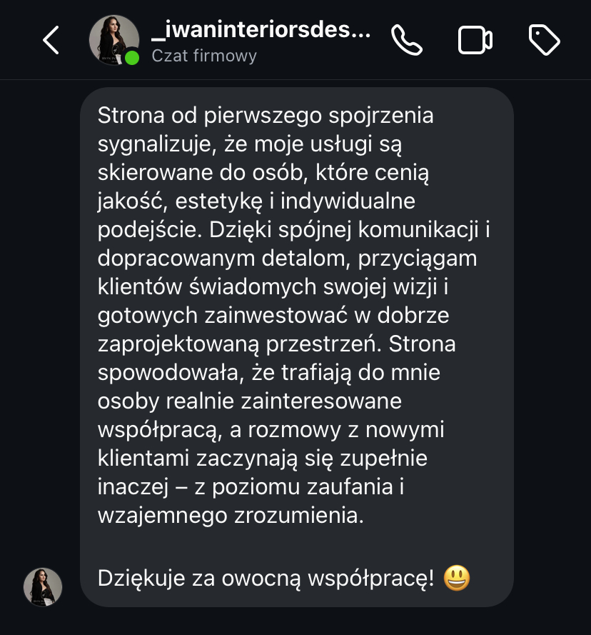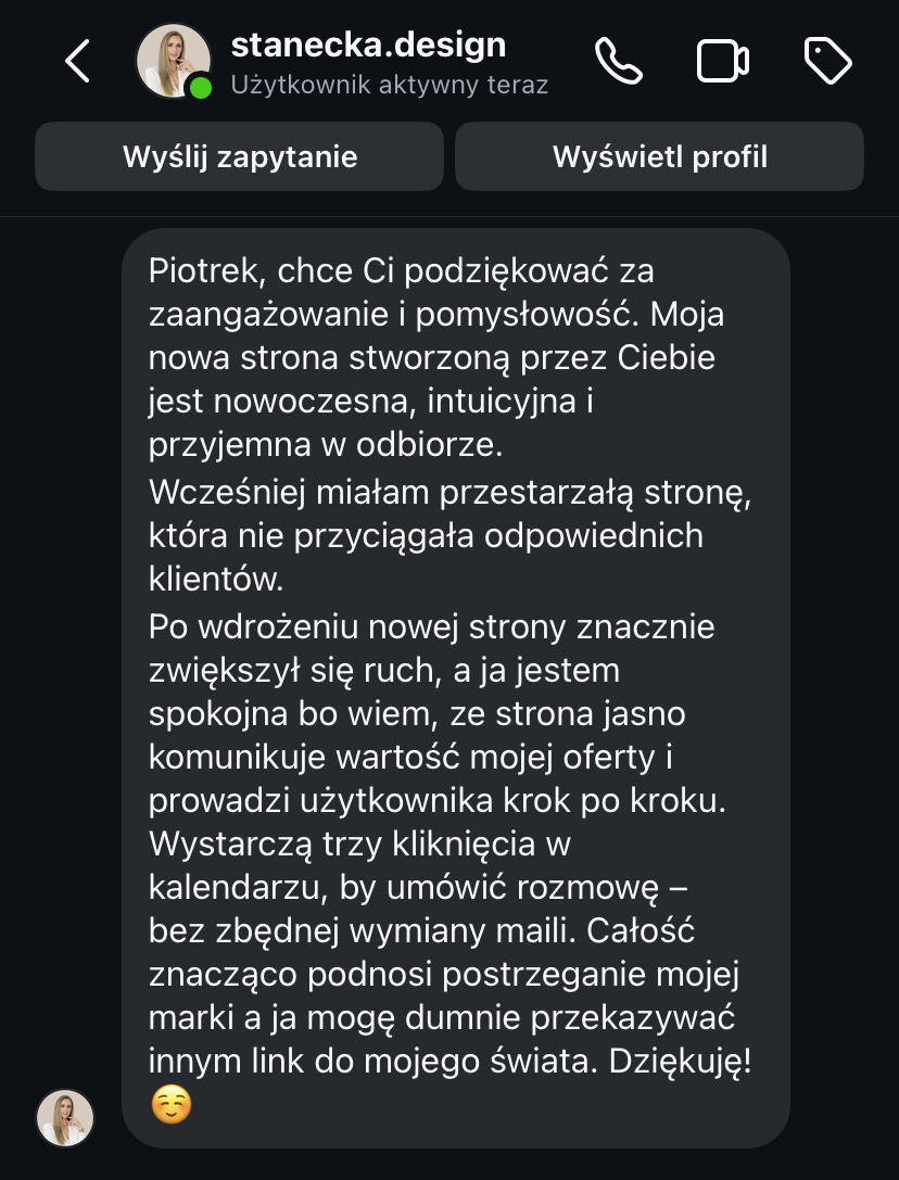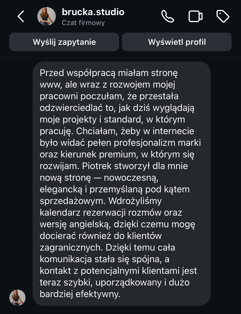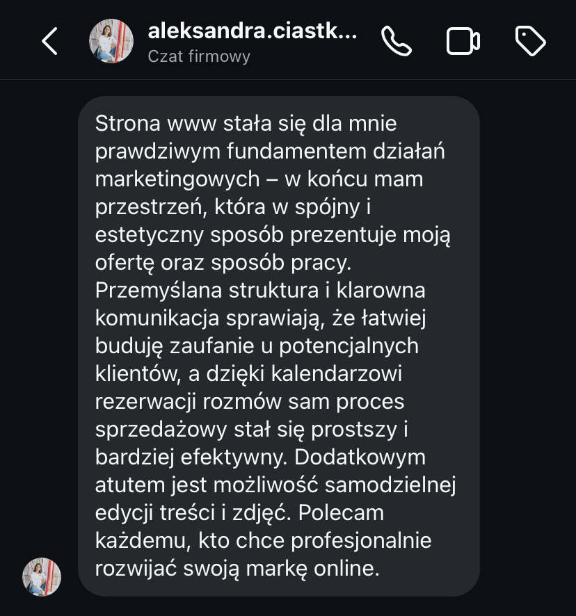 „Po rozpoczęciu działalności jedna z pierwszych myśli to była strona internetowa. To był pierwszy krok, który poprowadził mnie do klientów premium. Jestem bardzo zadowolona.”