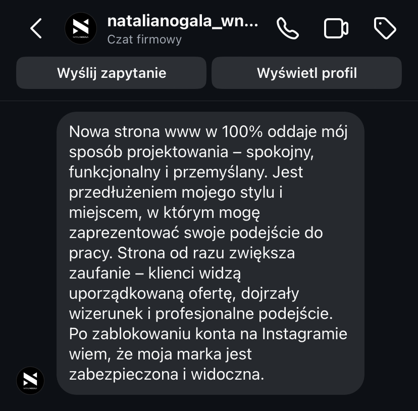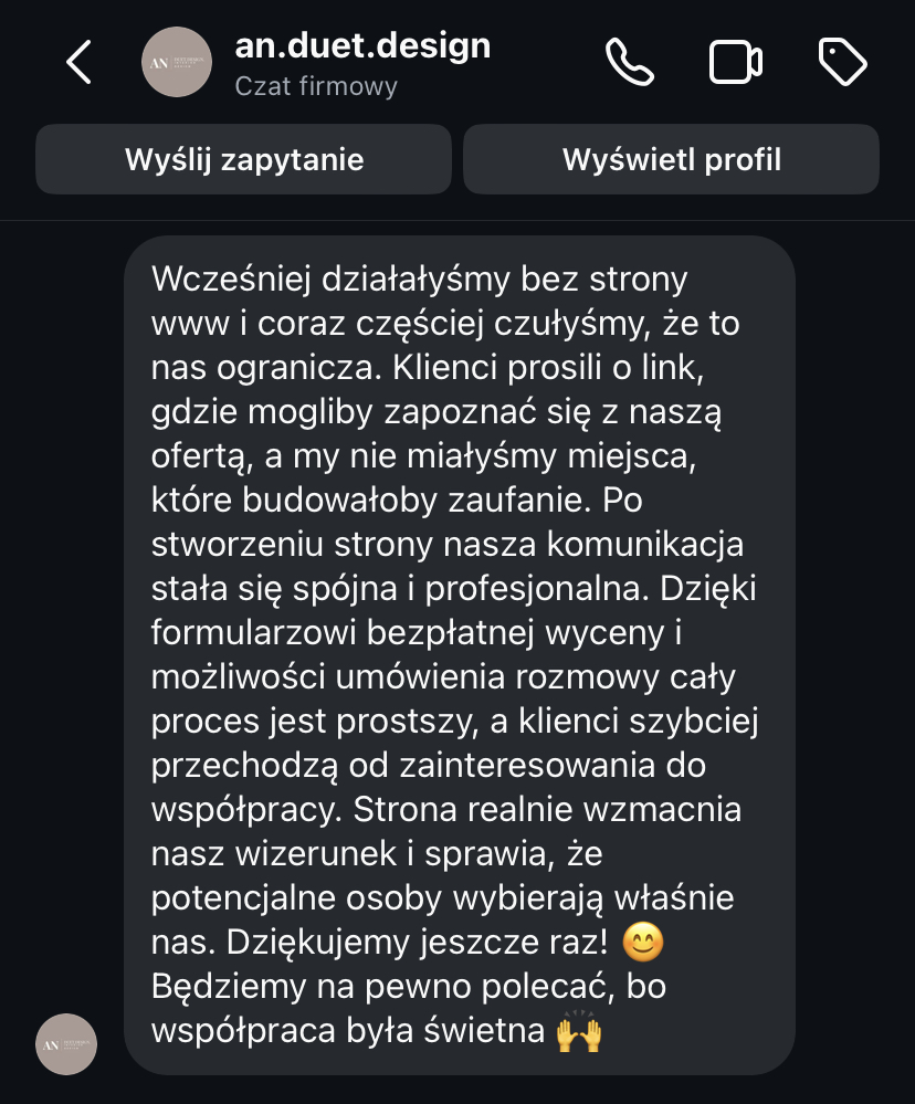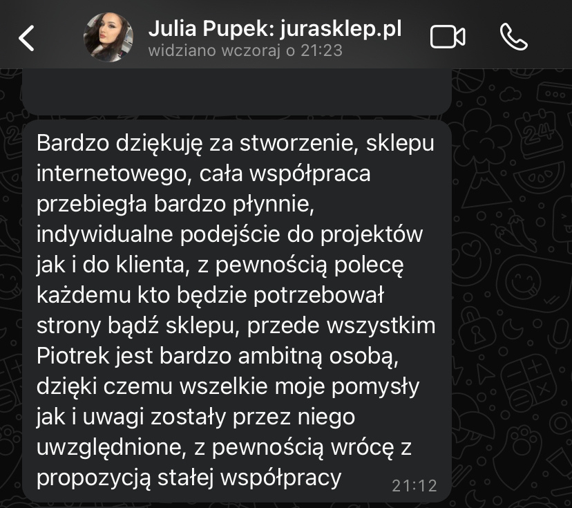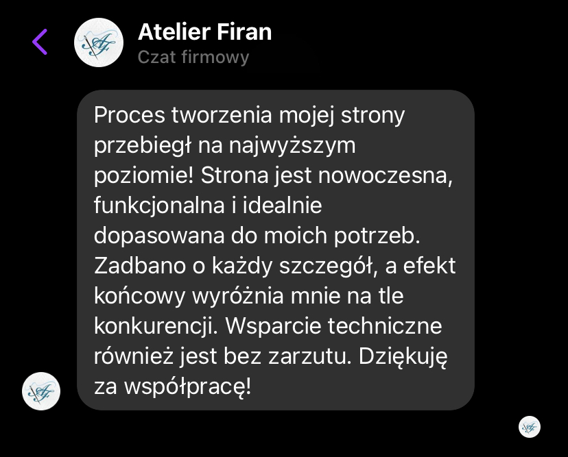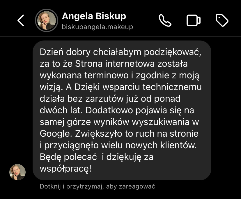 „Po rozpoczęciu działalności jedna z pierwszych myśli to była strona internetowa. To był pierwszy krok, który poprowadził mnie do klientów premium. Jestem bardzo zadowolona.”