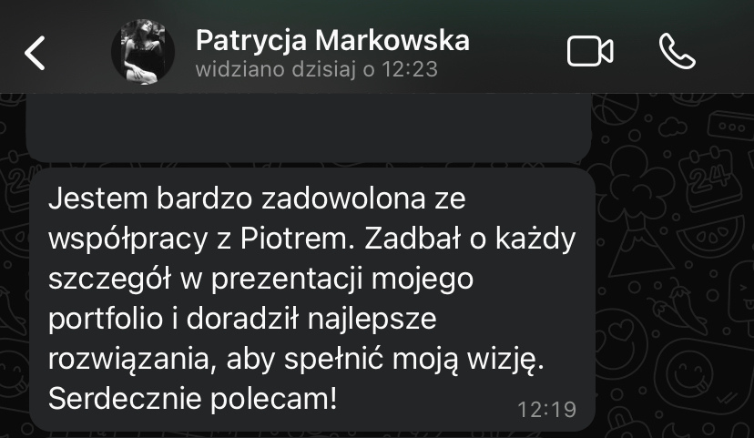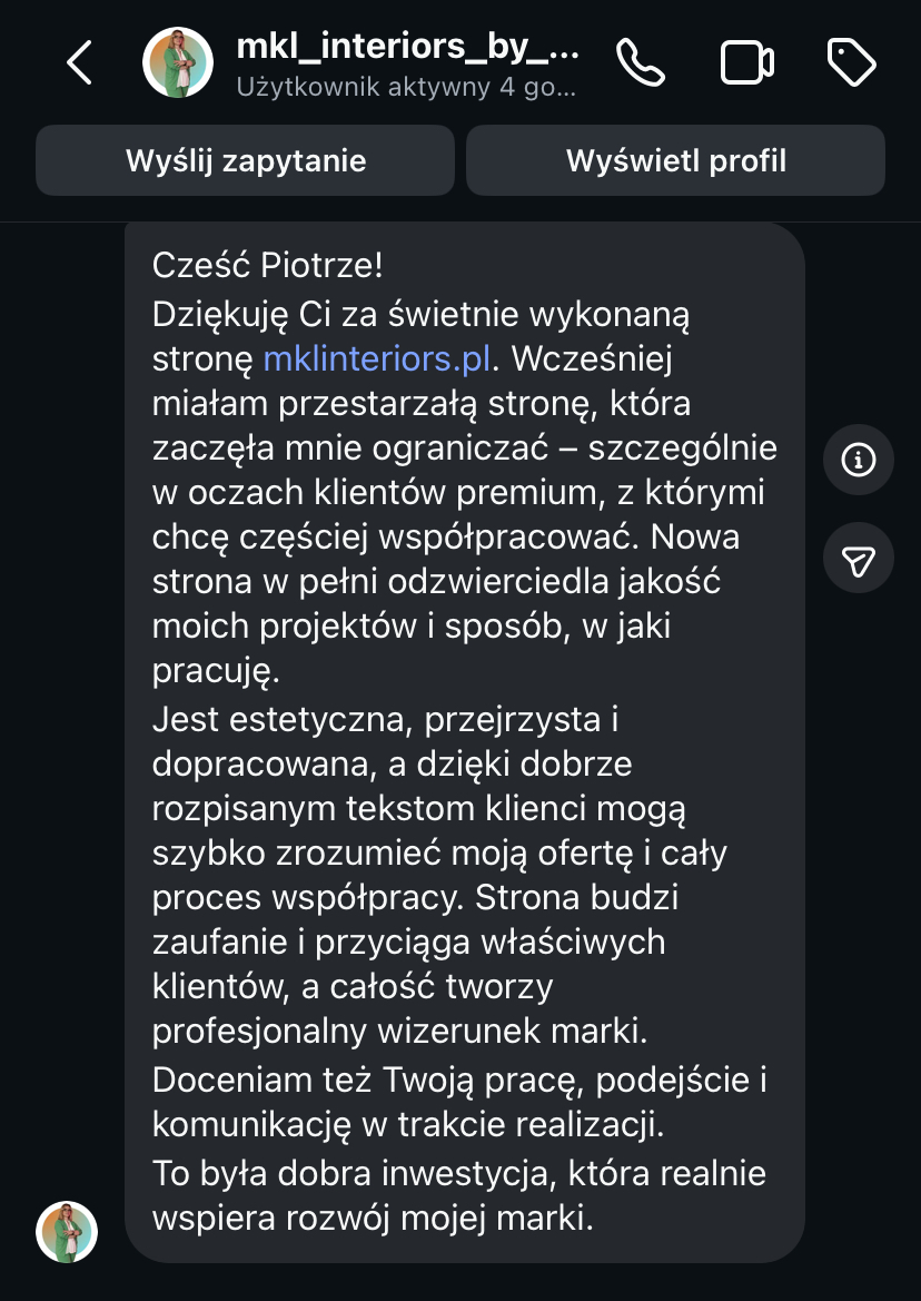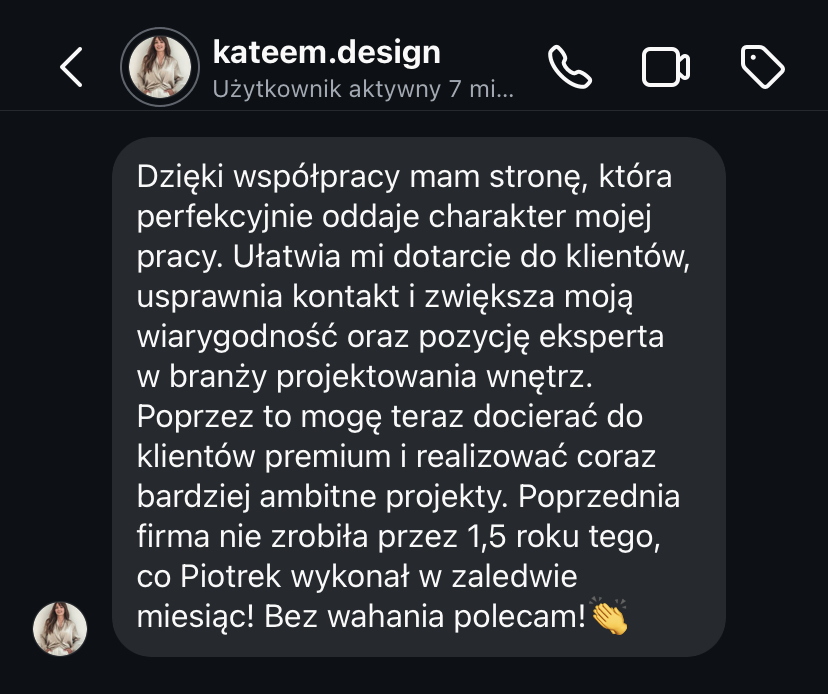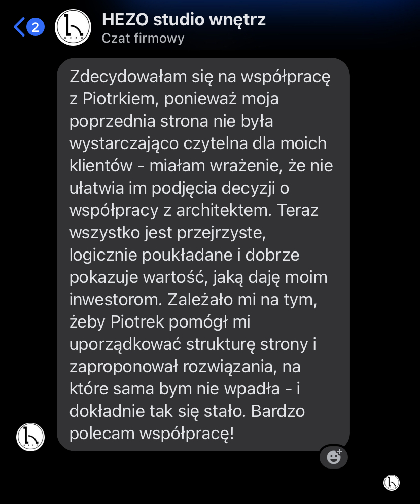 „Zauważyłam, że Piotrek specjalizuję się w stronach dla architektów i projektantów wnętr i będzie odpowiednią osobą do tego, żeby dobrać najlepsze rozwiązania. I tak rzeczywiście było!”